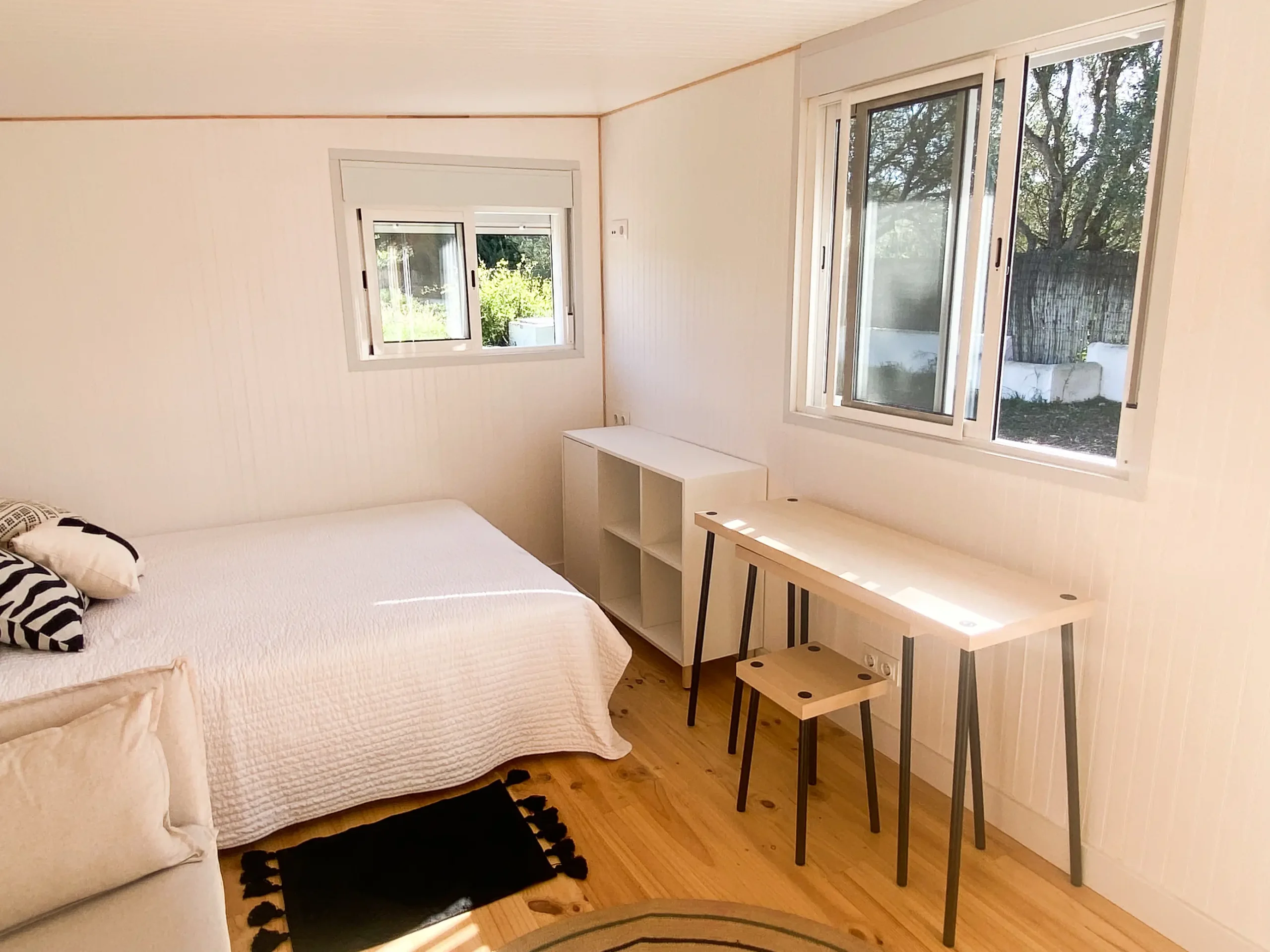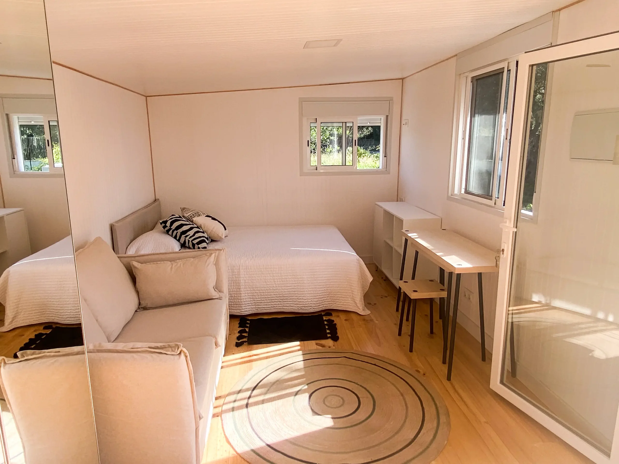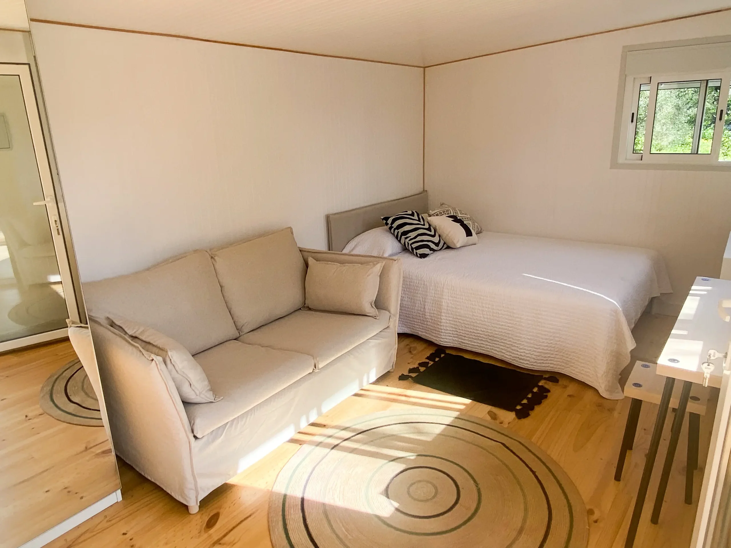 La cabaña de madera tiene cama de matrimonio, zona de estar con un sofá, un escritorio, amplio armario con espejo y zona de cocina con barra frente a una ventana que da al jardín. No se pueden alojar niños o bebés.