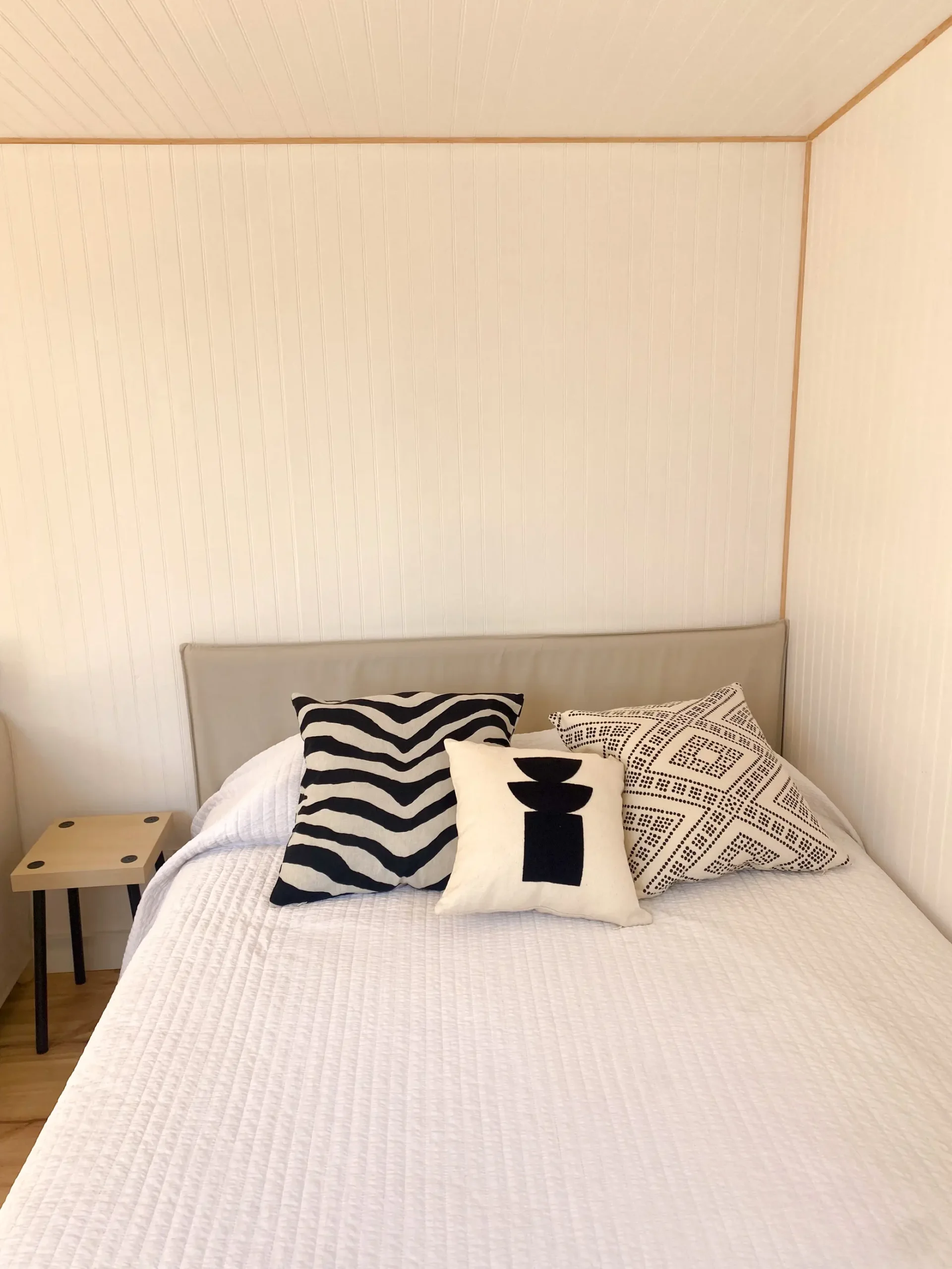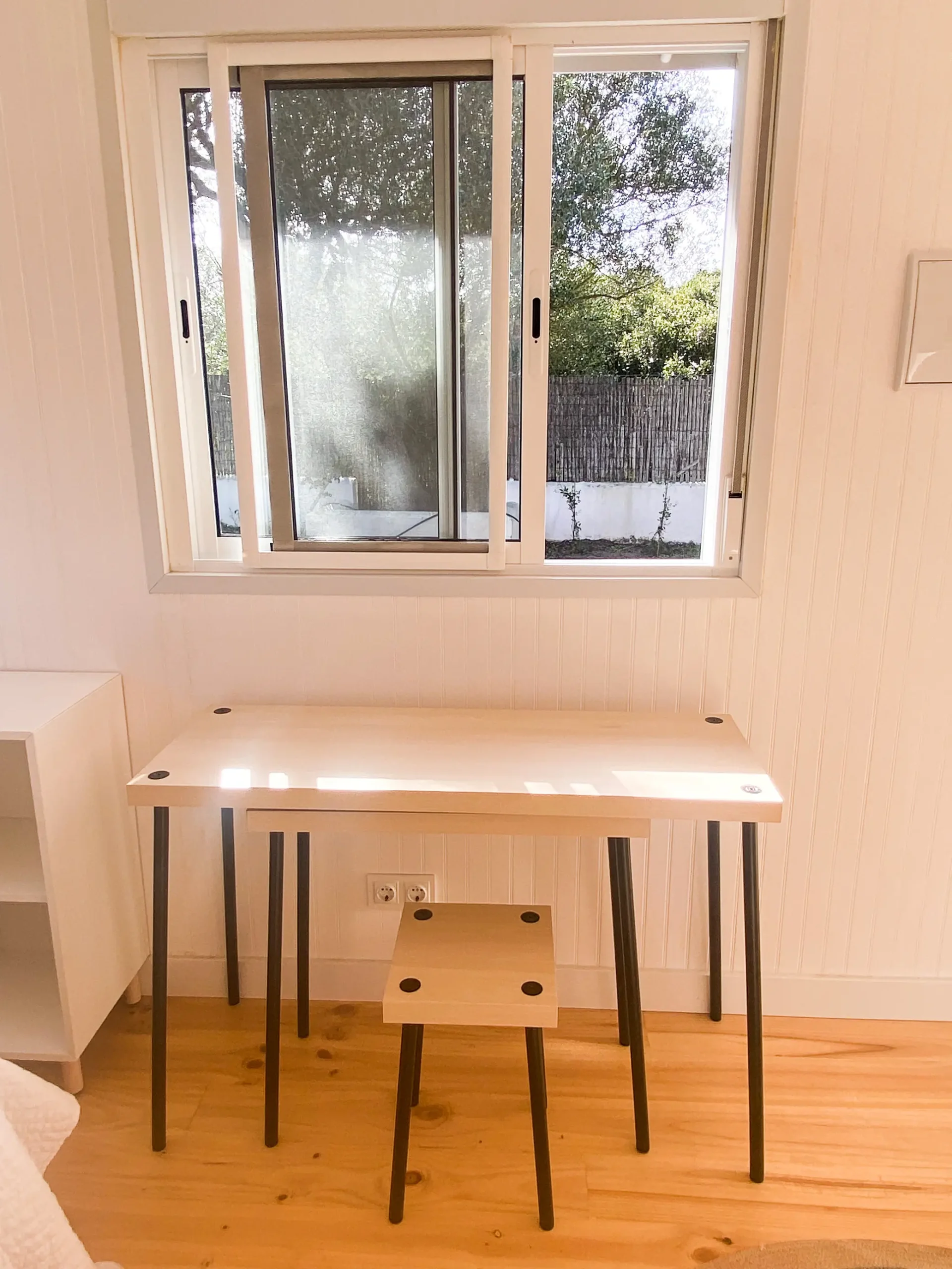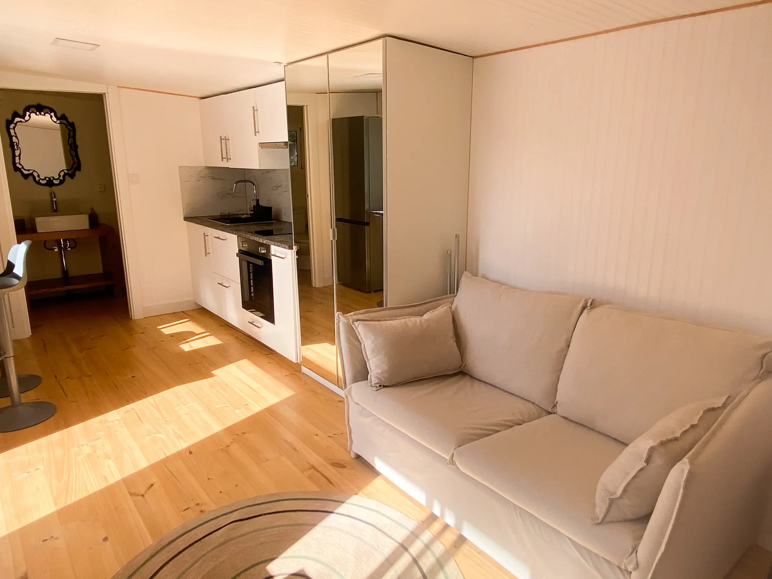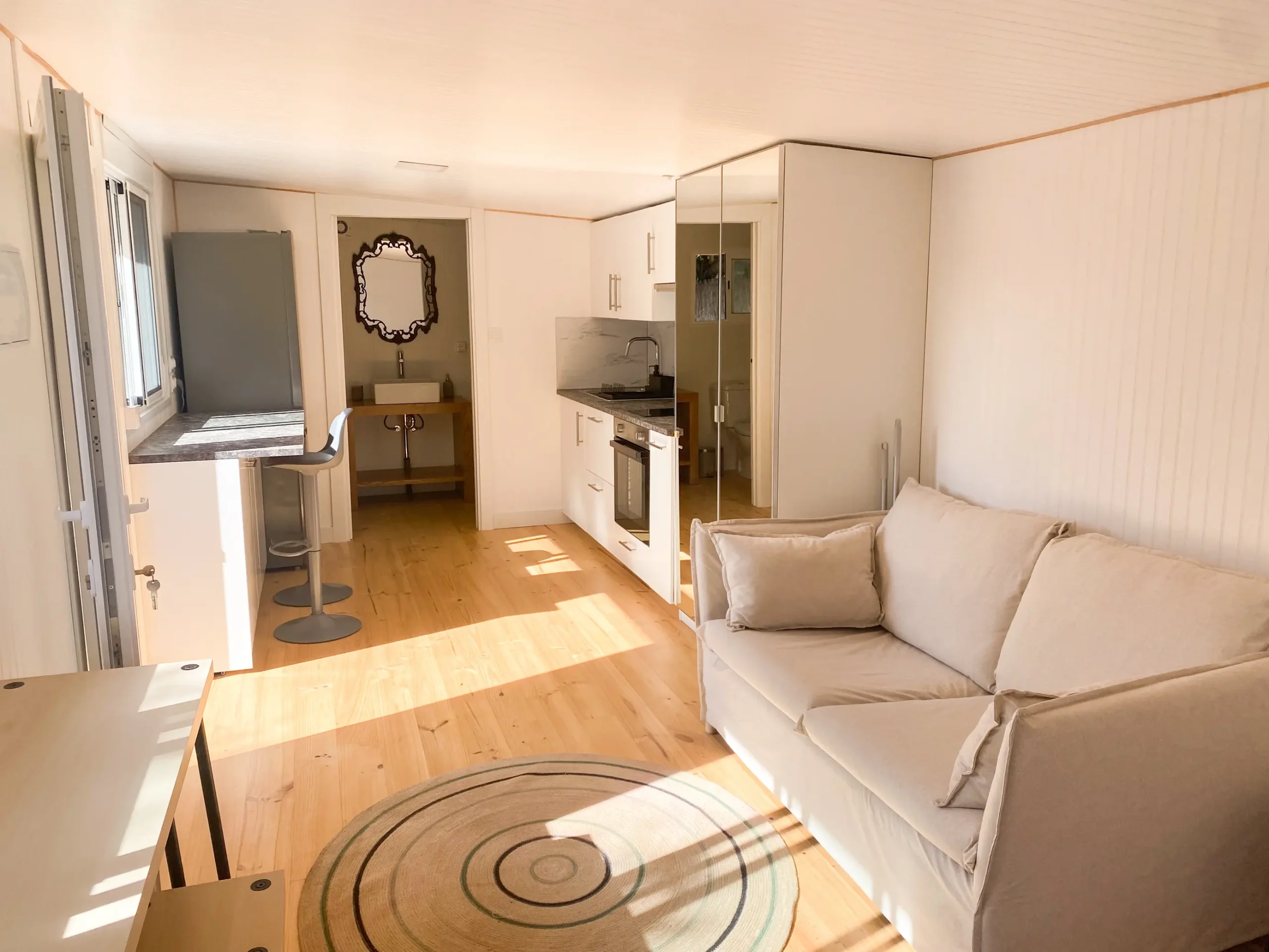 La cabaña de madera tiene cama de matrimonio, zona de estar con un sofá, un escritorio, amplio armario con espejo y zona de cocina con barra frente a una ventana que da al jardín. No se pueden alojar niños o bebés.