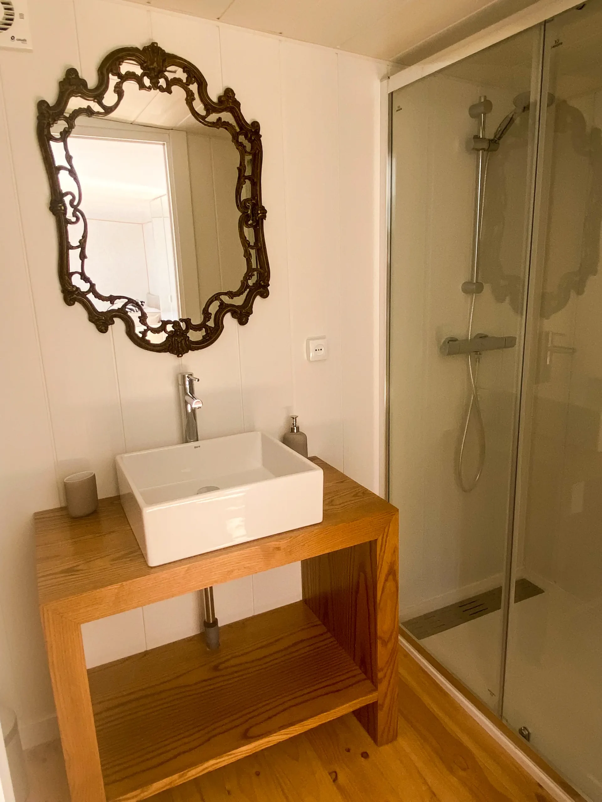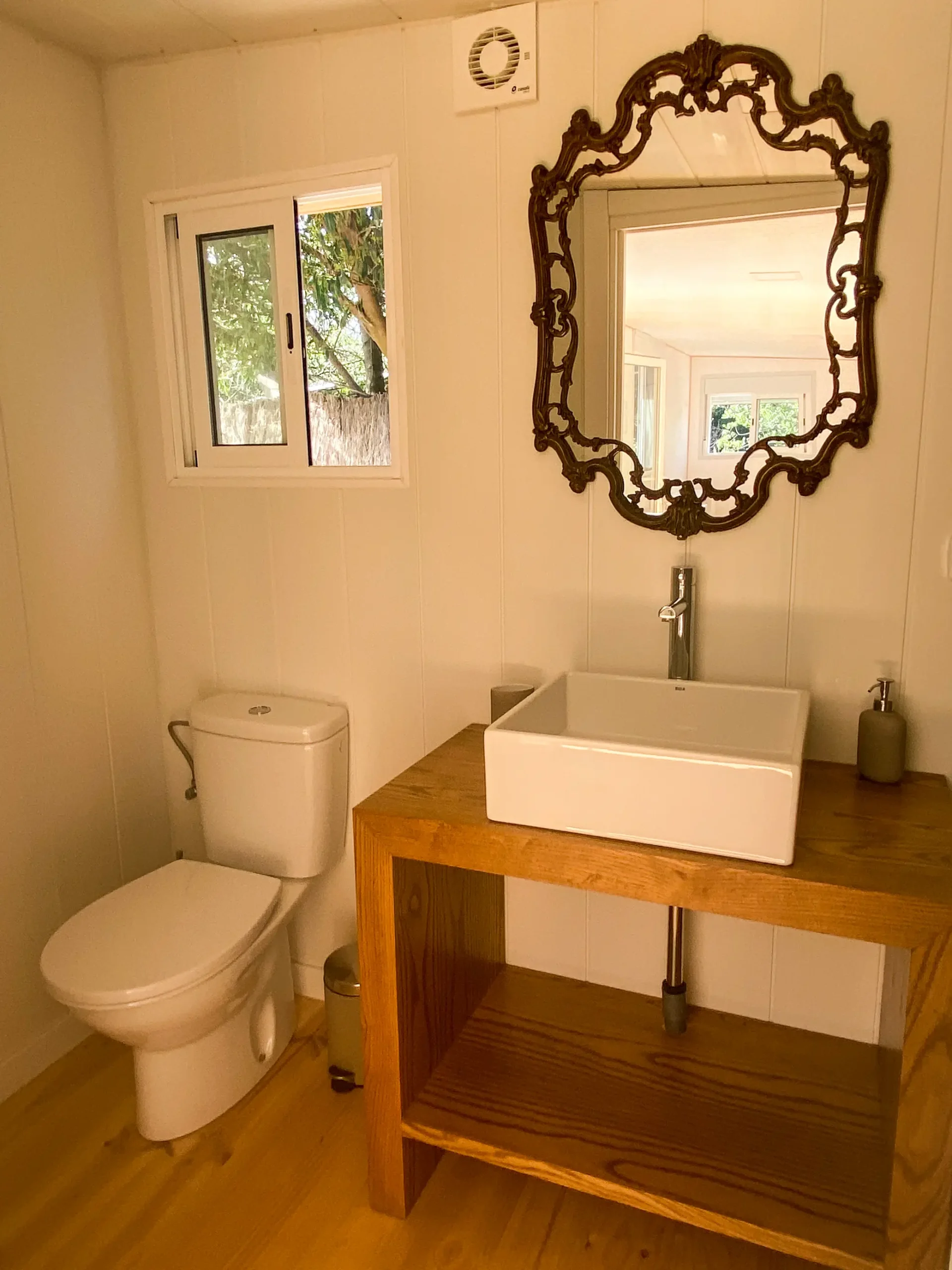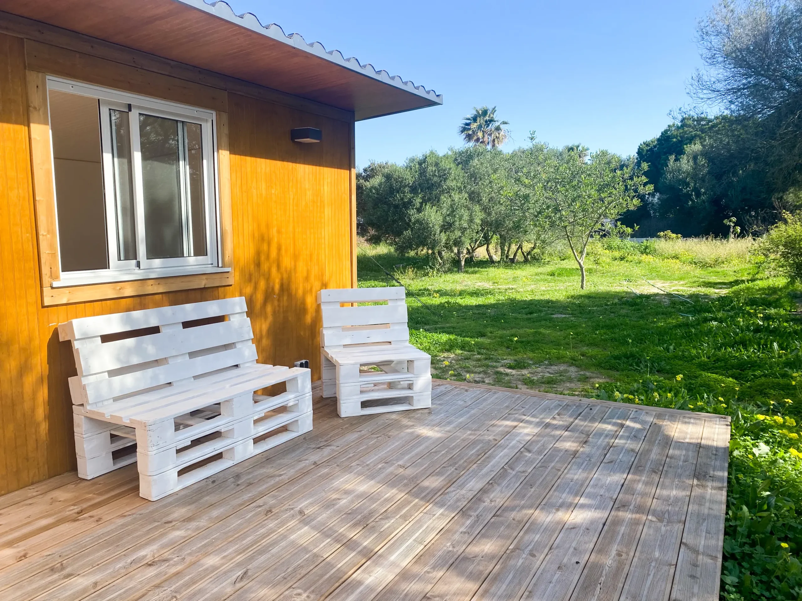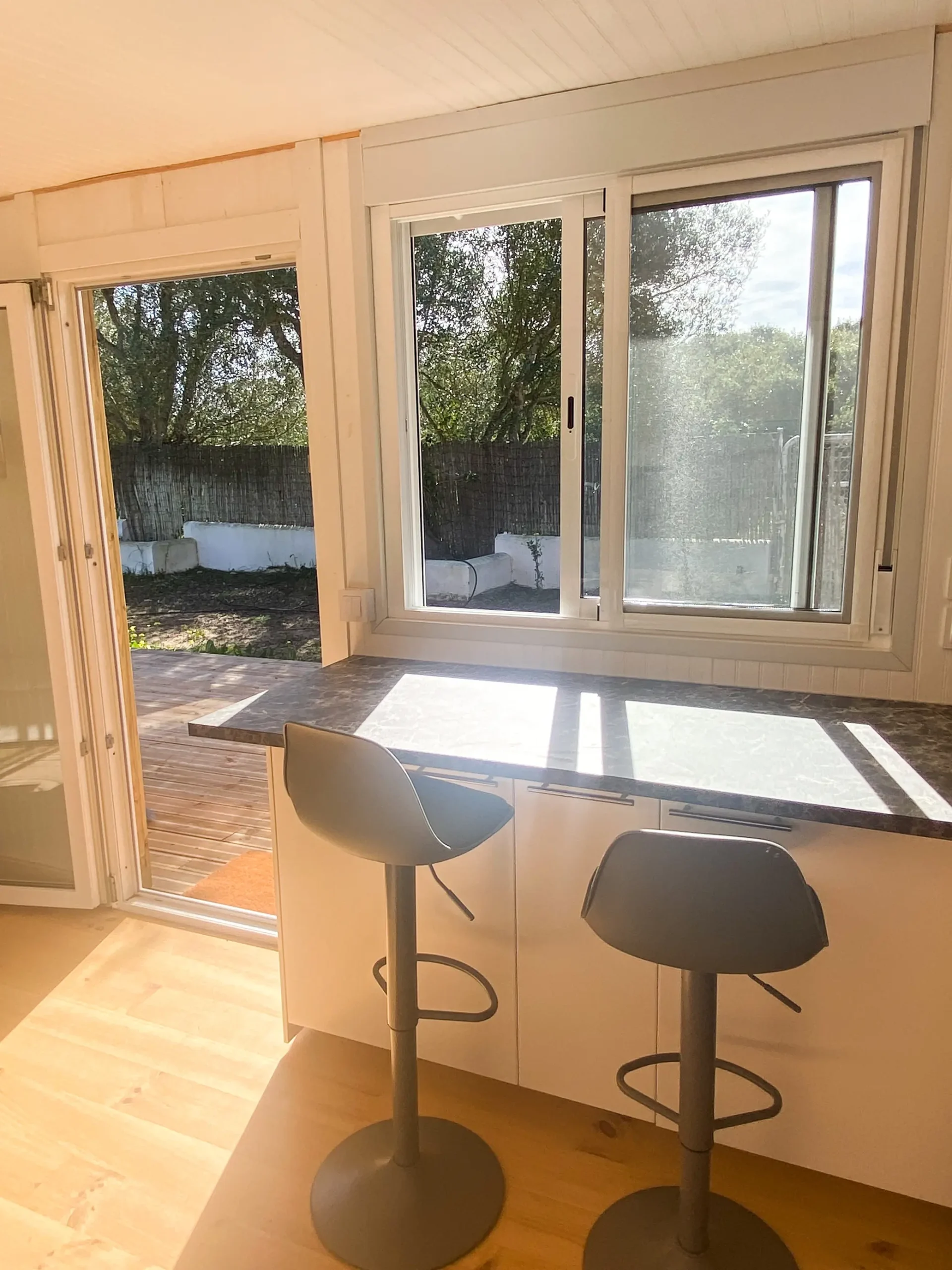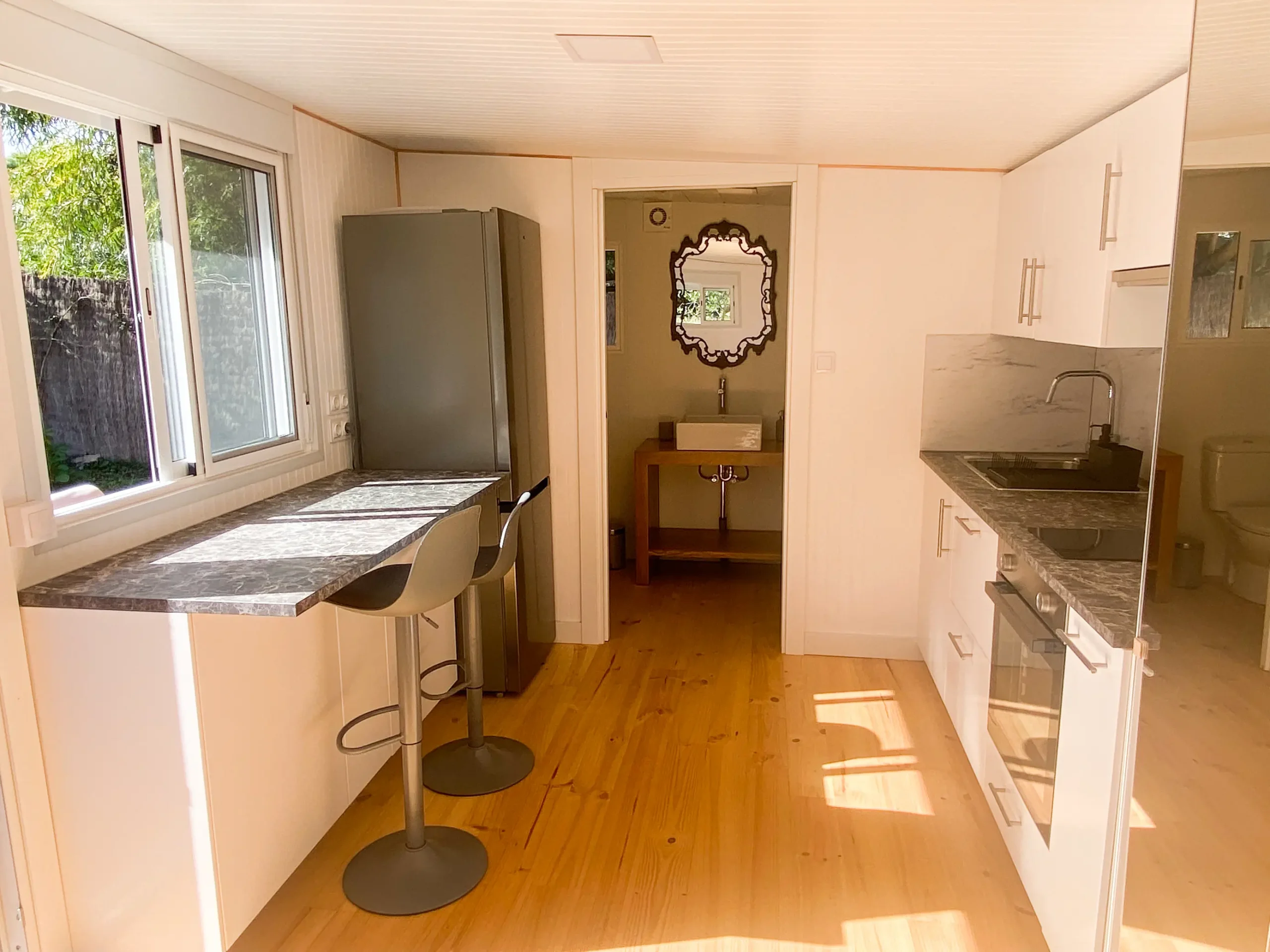 Es nuevo y la cocina está completamente equipada, nevera grande, horno, extractor y menaje. Tiene muchas ventanas y buena ventilación cruzada. El porche de madera es amplio y tiene una zona para comer en el exterior.