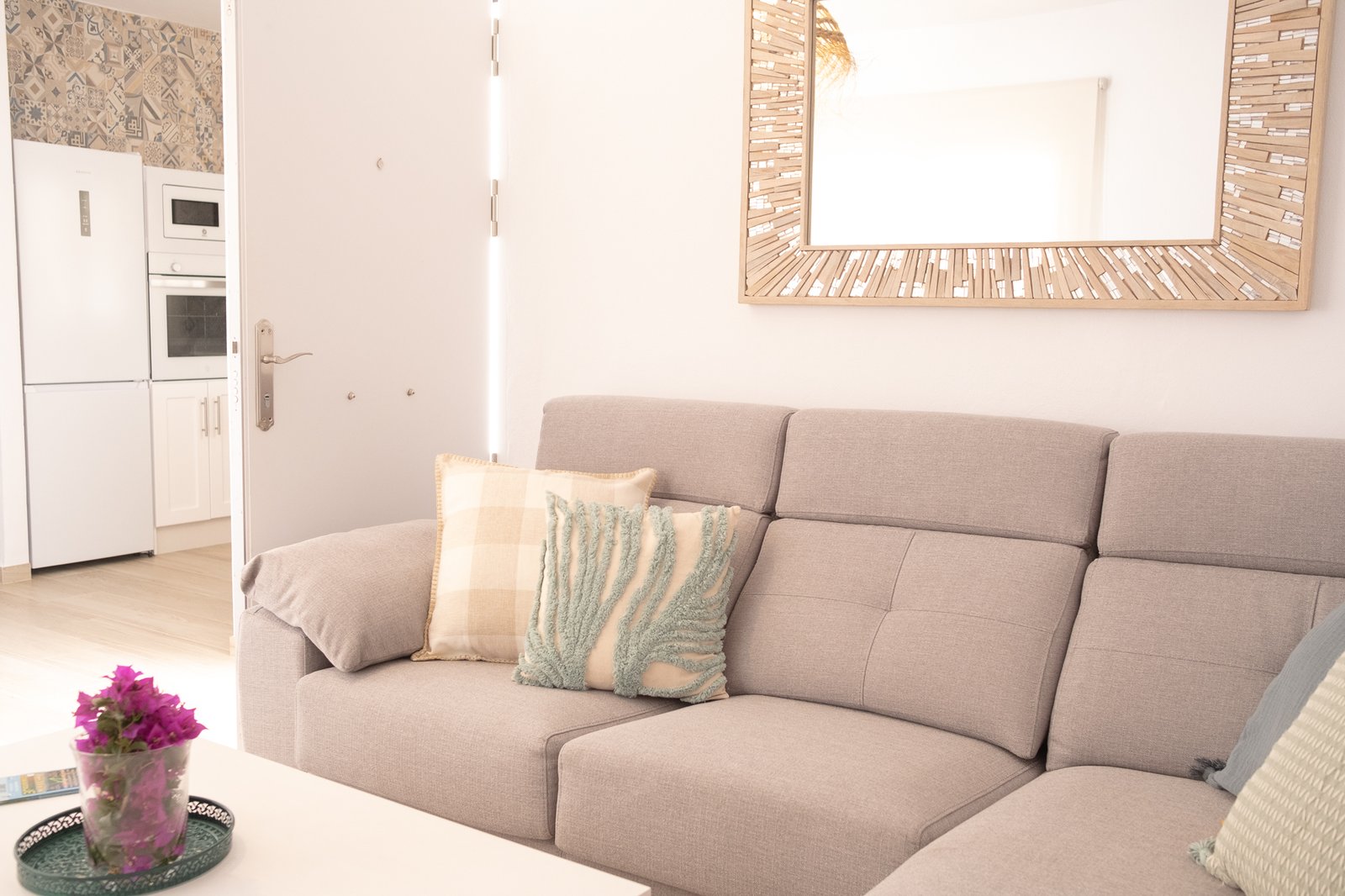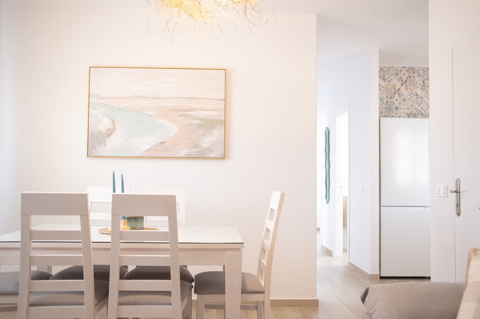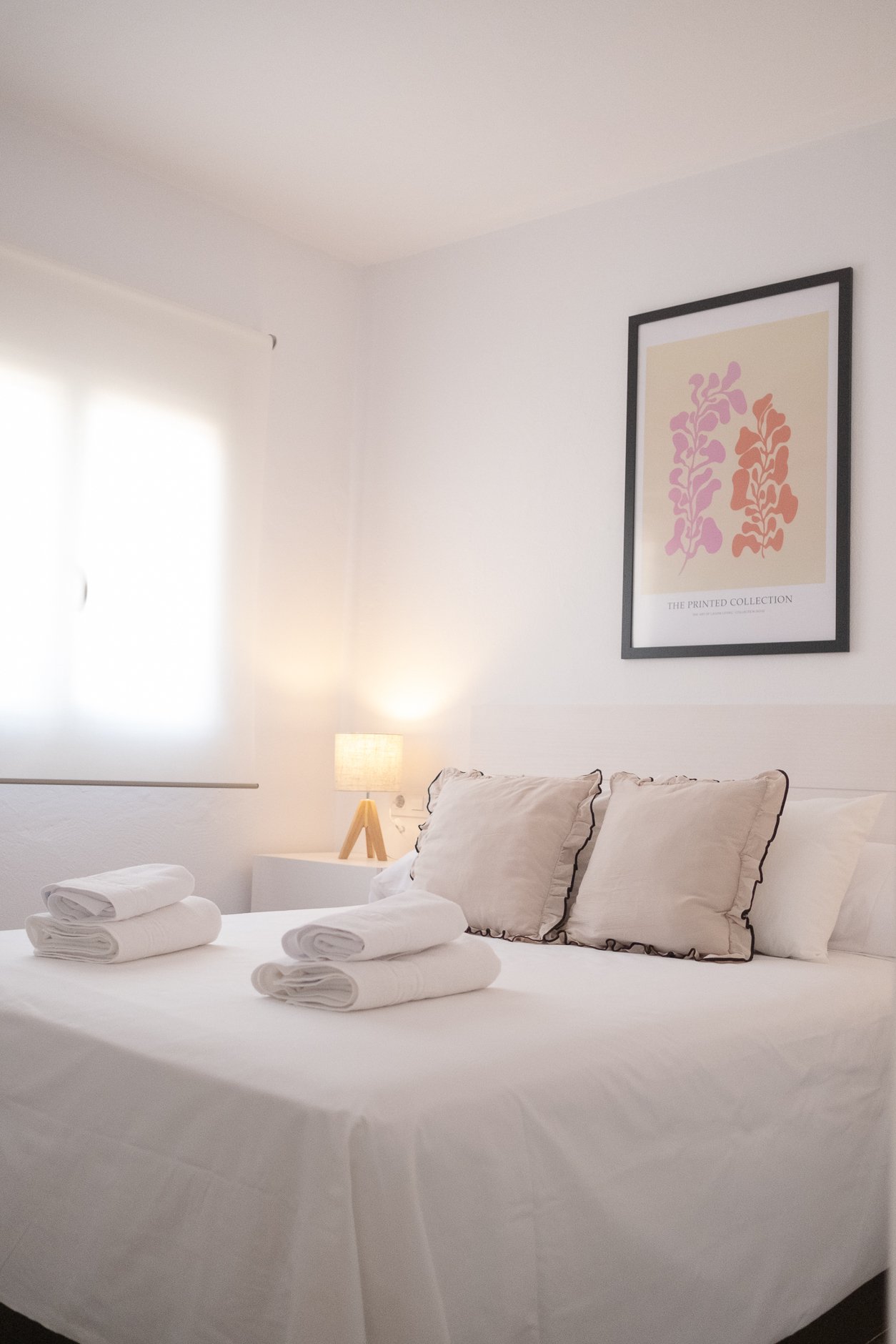 El dormitorio principal cuenta con una cama de 150cm x 190cm, dos mesillas, cabecero y un armario empotrado. El segundo dormitorio tiene también una cama doble de 135cm x 190cm. El tercer dormitorio cuenta con dos camas de 90, una mesilla y un armario empotrado.