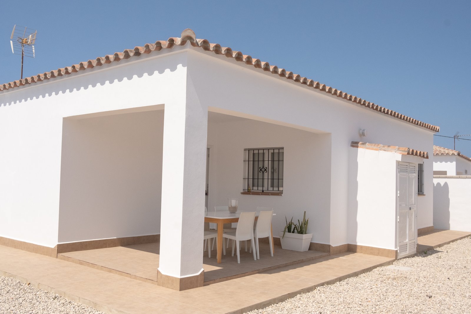 Además del jardín que hemos descrito, en la parcela se encuentra la casa unifamiliar con un cuartito para la lavadora. Antes de la entrada a la vivienda nos encontramos el porche con una bonita mesa y 6 sillas para pasar una agradable noche. Una vez cruzamos la puerta de entrada tenemos el salón cocina y el comedor, el salón está equipado con aire acondicionado, sofá de 6 plazas y smart tv. La cocina está totalmente equipada frigorífico, microondas, campana, vitro y menaje de cocina.