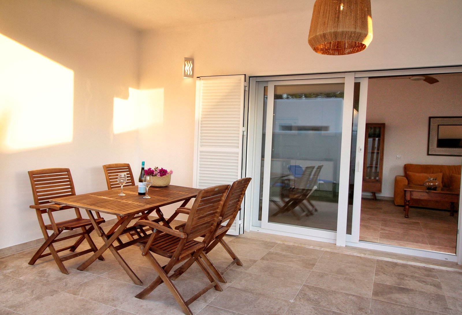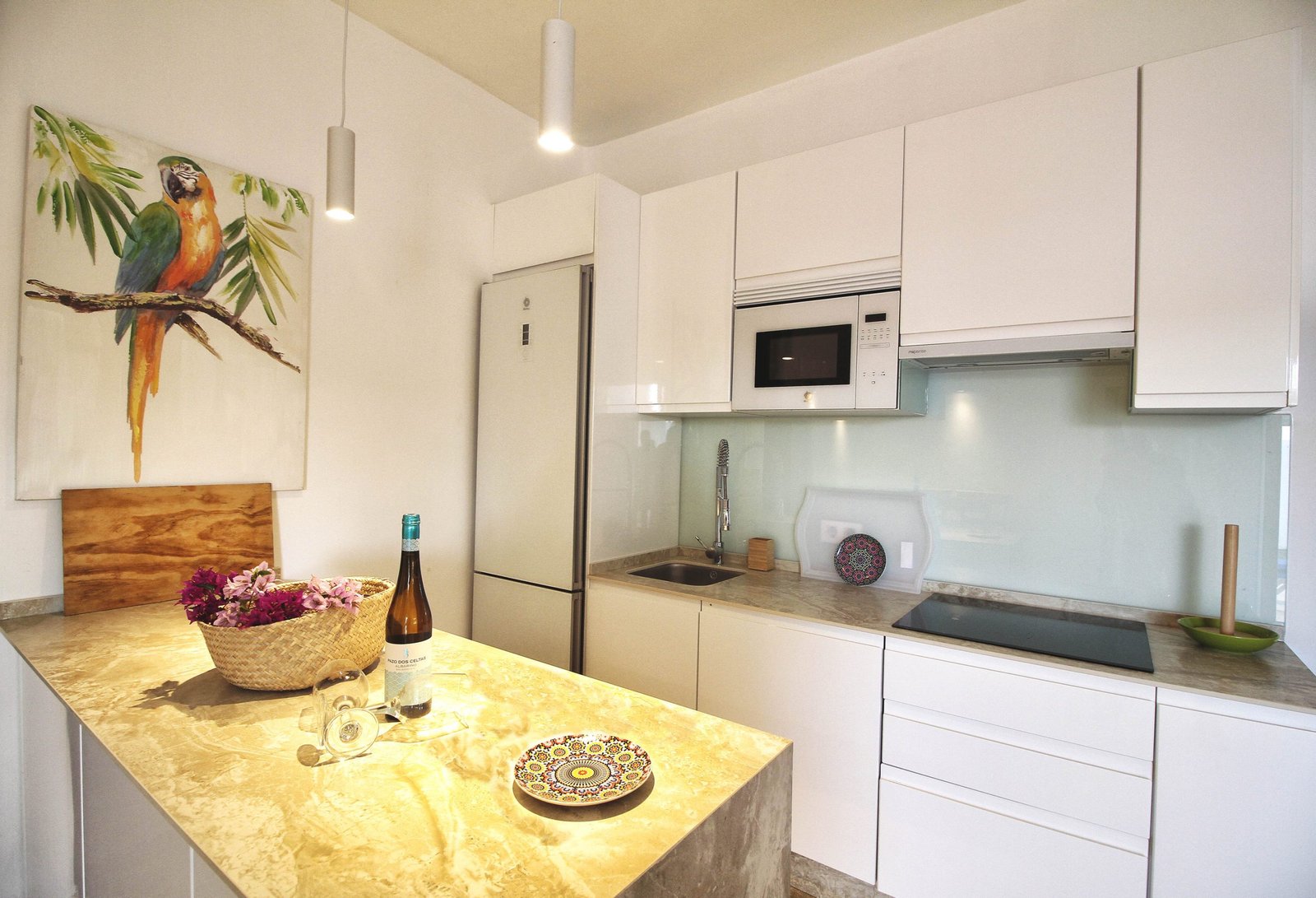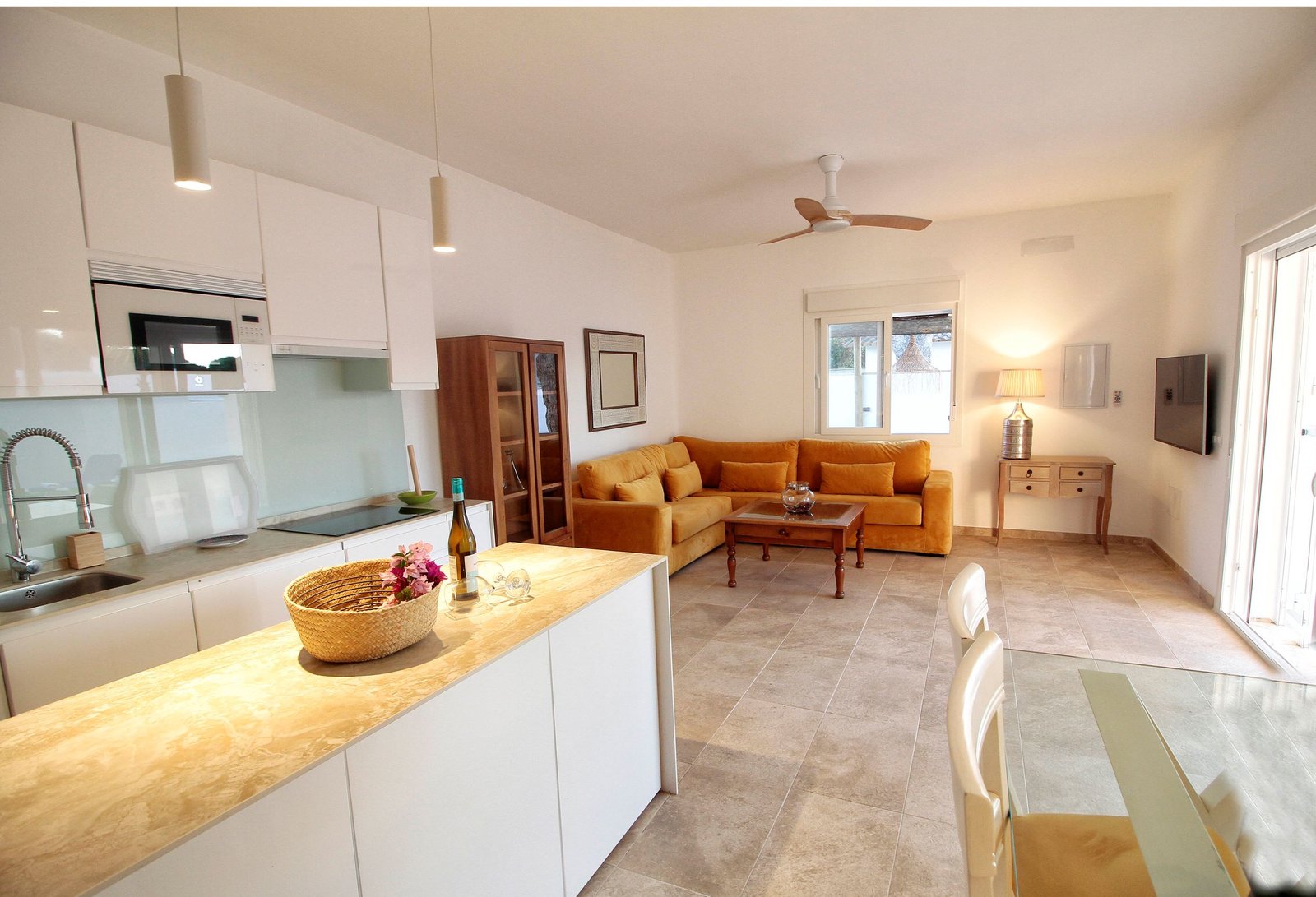 Una vez en el interior nos encontraremos en el salón cocina. El sofá esquinero de 6 plazas, el televisor con smart tv, ventilador de techo, aire acondicionado hace de esta casa un lugar idóneo para descansar. La cocina equipada con todos los utensilios necesarios para hacer las mejores de nuestras recetas en nuestros días de descanso es posible, dispone de batidora, tostador, cafetera italiana, hoyas, sartenes, microondas, lavavajilla, frigorífico.