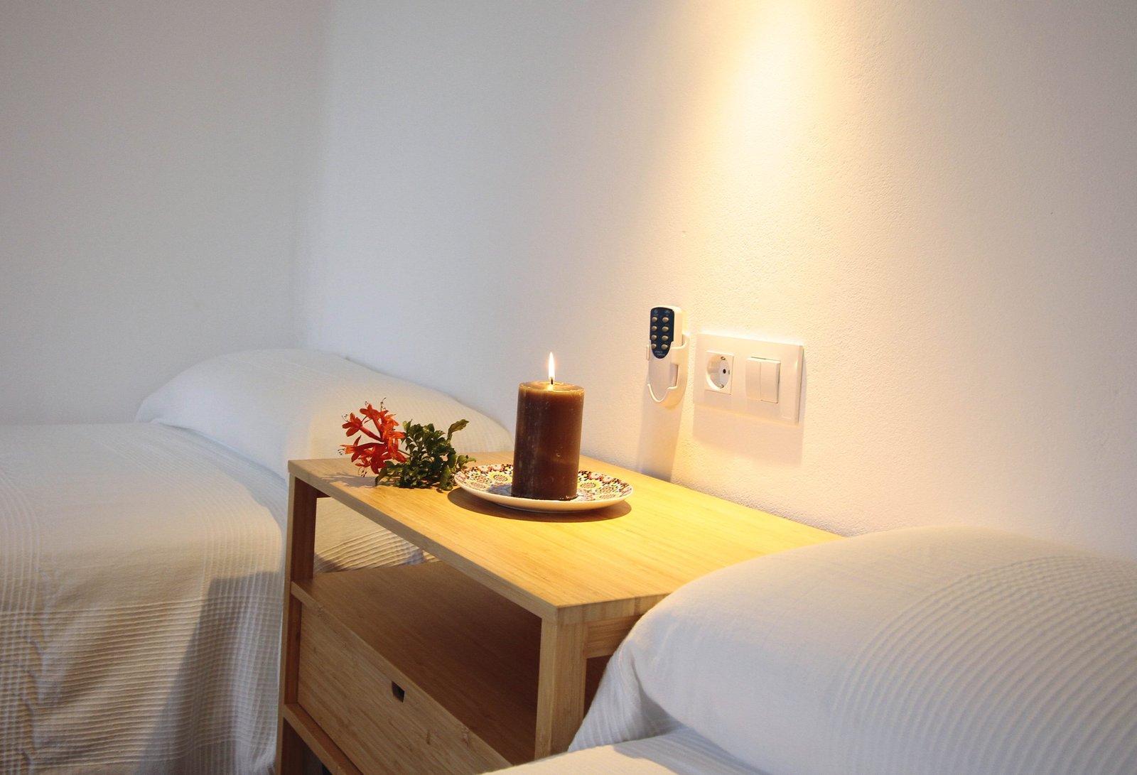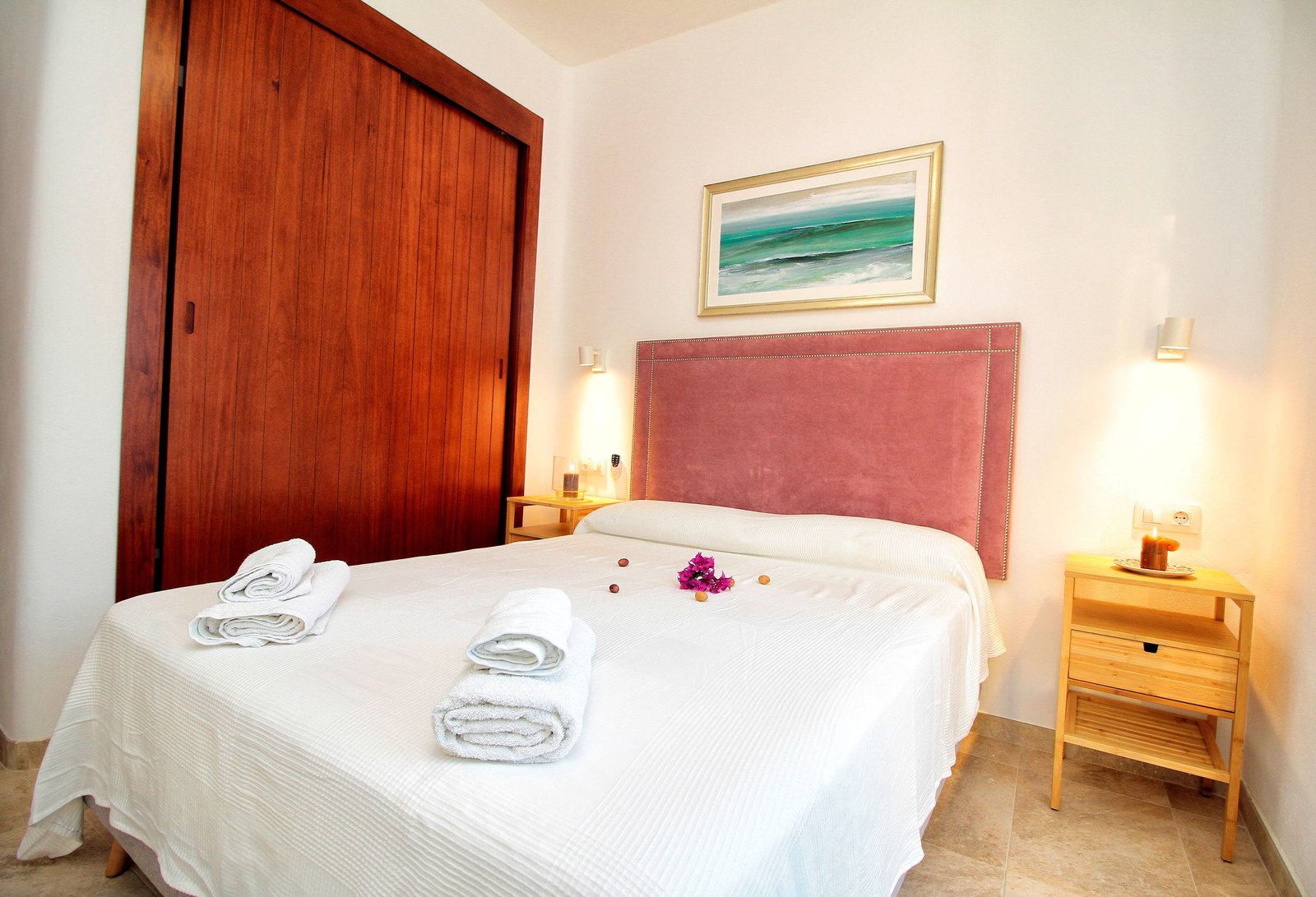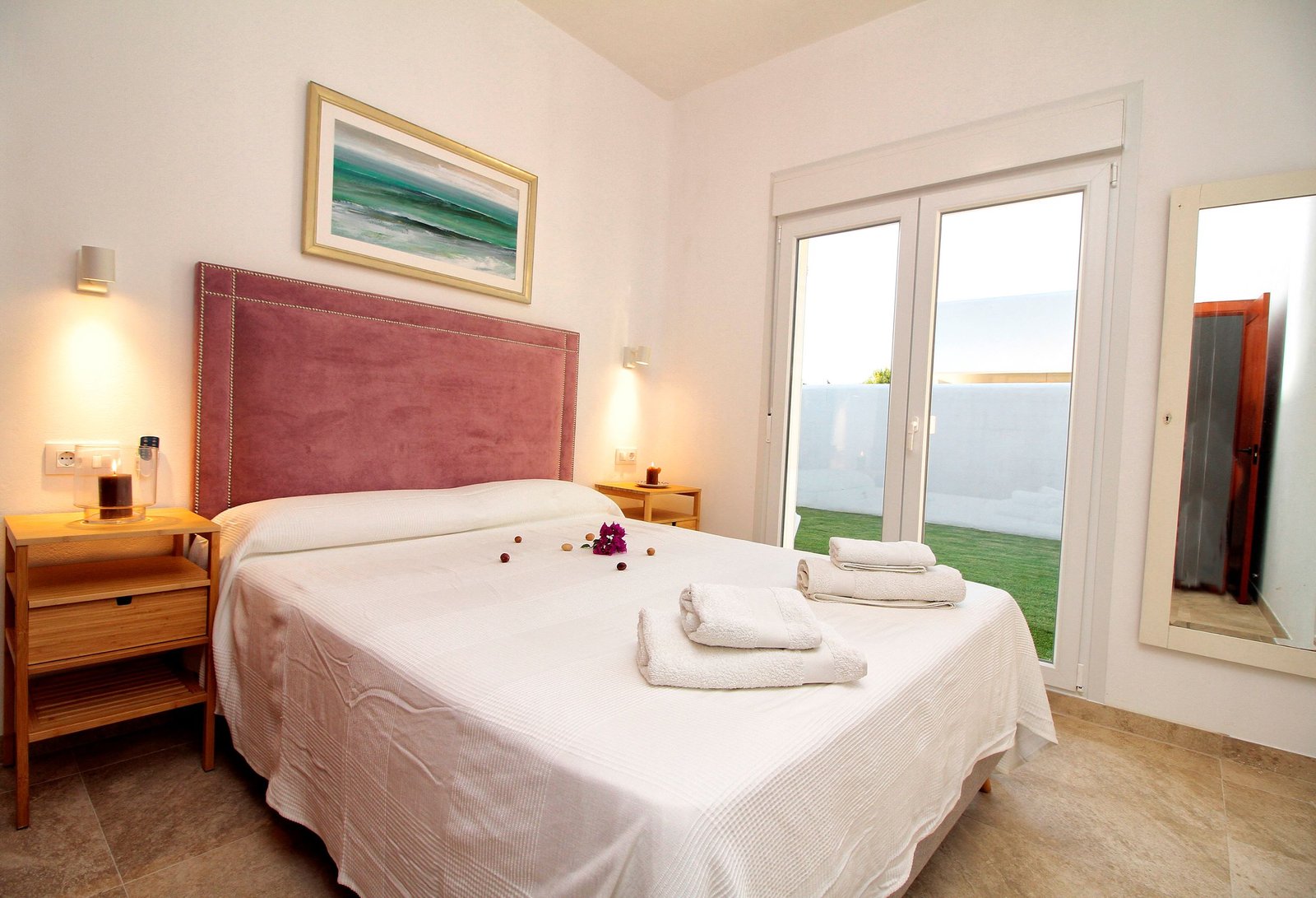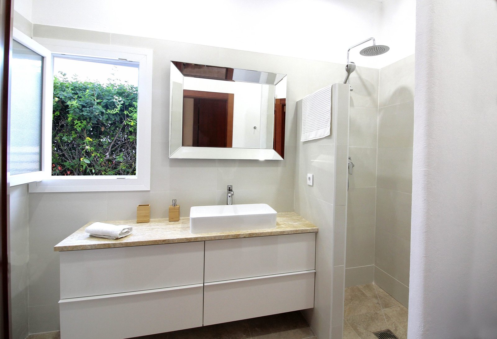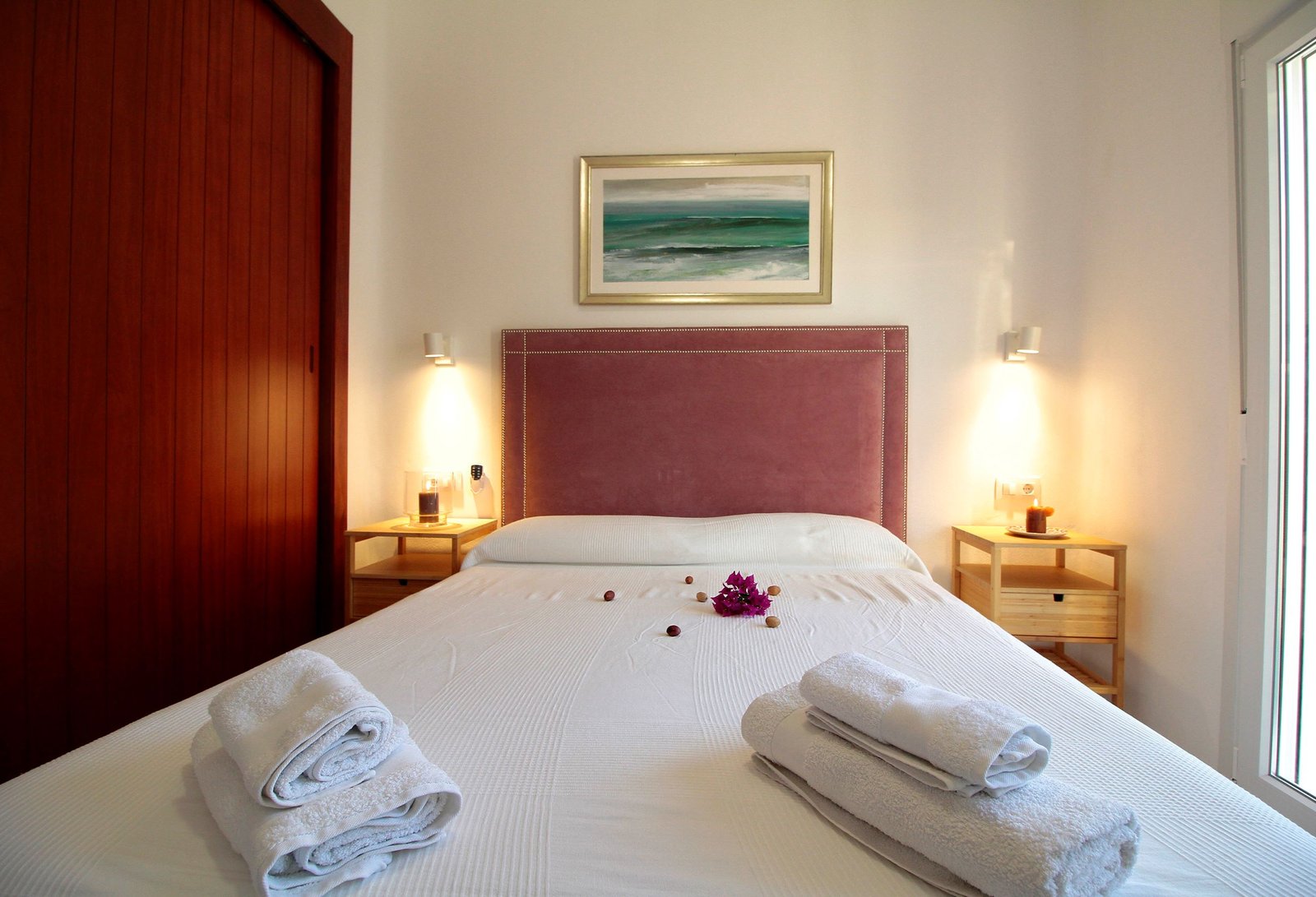 Para acceder a las dos habitaciones cruzamos un amplio pasillo con armario empotrado y una puerta que accede al único baño. El baño dispone de una amplia placa ducha sin escalones. En el dormitorio de matrimonio tenemos una cama de 150cm x 190cm, dos mesillas de noche, un espejo y un ventilador de techo para las noches calurosas, su ventana balconera nos da acceso al jardín y piscina. La habitación invitados dispone de un armario empotrado, dos camas de 90cm x 190cm una mesilla de noche, un ventilador de techo, su ventana balconera accede al césped y tiene una agradable vistas al hermoso pino. De aquí su nombre Casa Pino Zahora.